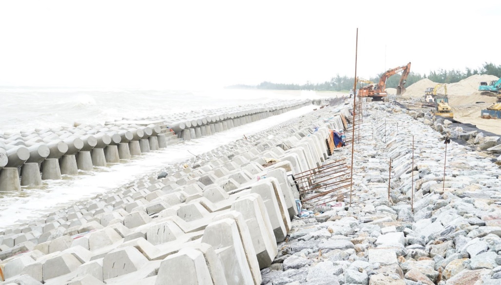 The Tetrapod concrete blocks along the 250-metre embankment have been installed, helping to block sea waves and ensure safety during construction.