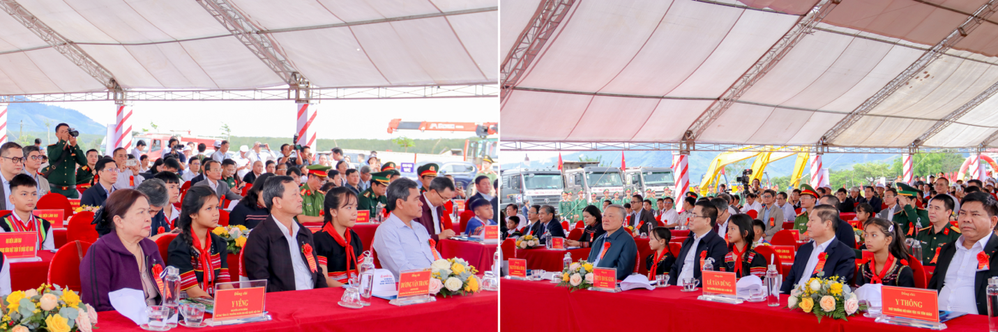 At the Mô Rai site, General Trần Quang Phương - Vice Chairman of the National Assembly - together with the National Assembly delegation and leaders of Military Region 5 attended the groundbreaking ceremony of the Mô Rai inter-level boarding school. Provincial representatives included Deputy Secretary of the Provincial Party Committee U Huấn and leaders of provincial departments.