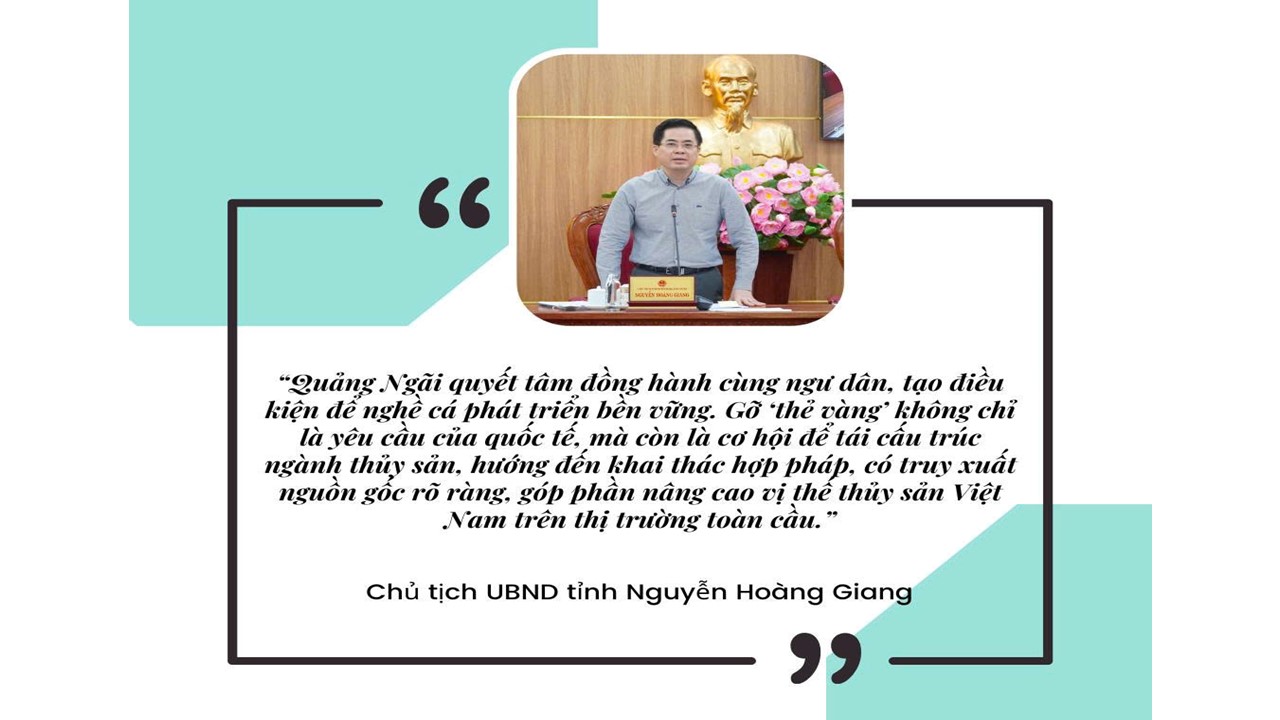 Chủ tịch UBND tỉnh Nguyễn Hoàng Giang khẳng định: “Quảng Ngãi quyết tâm đồng hành cùng ngư dân, tạo điều kiện để nghề cá phát triển bền vững. Gỡ ‘thẻ vàng’ không chỉ là yêu cầu của quốc tế, mà còn là cơ hội để tái cấu trúc ngành thủy sản, hướng đến khai thác hợp pháp, có truy xuất nguồn gốc rõ ràng, góp phần nâng cao vị thế thủy sản Việt Nam trên thị trường toàn cầu.”