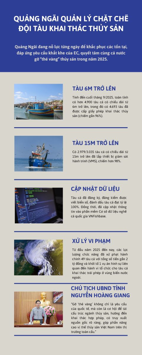 Theo Sở Nông nghiệp và Môi trường tỉnh Quảng Ngãi, tính đến cuối tháng 9/2025, toàn tỉnh có hơn 4.900 tàu cá có chiều dài từ 6m trở lên, trong đó có 4.693 tàu đã được cấp giấy phép khai thác thủy sản (chiếm gần 96%); có 2.979/3.035 tàu cá có chiều dài từ 15m trở lên đã lắp thiết bị giám sát hành trình (VMS), chiếm hơn 98%. Tàu cá đã đăng ký, đăng kiểm được viết biển số, đánh dấu tàu cá đạt tỷ lệ 100%. Đồng thời, đã cập nhật thông tin vào phần mềm Cơ sở dữ liệu nghề cá quốc gia VNFishbase. Từ năm 2024 đến nay, Quảng Ngãi không để xảy ra tàu cá, ngư dân vi phạm vùng biển nước ngoài.
