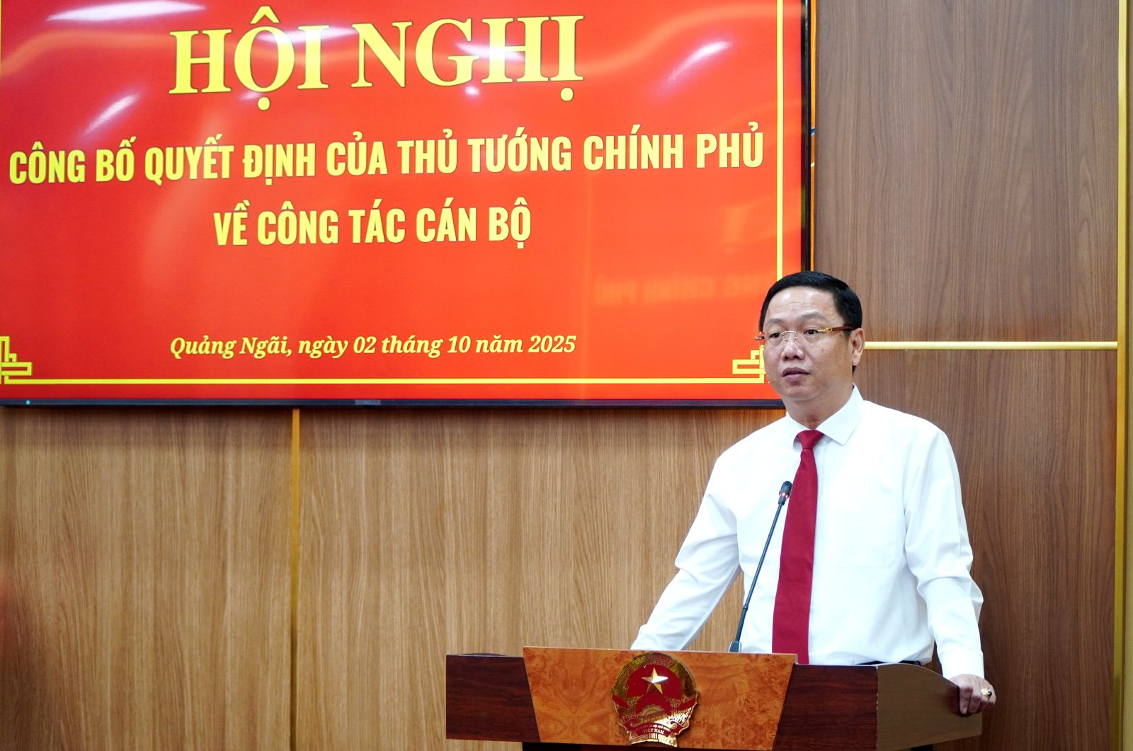 Tại hội nghị, Giám đốc Sở Nội vụ Tạ Công Dũng công bố các Quyết định của Thủ tướng Chính phủ gồm: Quyết định số 2166/QĐ-TTg về việc phê chuẩn kết quả bầu chức vụ Phó Chủ tịch UBND tỉnh Quảng Ngãi nhiệm kỳ 2021-2026 đối với ông Nguyễn Công Hoàng, Tỉnh ủy viên, Bí thư Đảng ủy, Chủ tịch Hội đồng nhân dân xã Ba Gia, tỉnh Quảng Ngãi và Quyết định số 2168/QĐ-TTg, phê chuẩn kết quả bầu chức vụ Phó Chủ tịch UBND tỉnh Quảng Ngãi nhiệm kỳ 2021-2026 đối với ông Đỗ Tâm Hiển, Tỉnh ủy viên, Bí thư Đảng ủy xã Khánh Cường, tỉnh Quảng Ngãi.