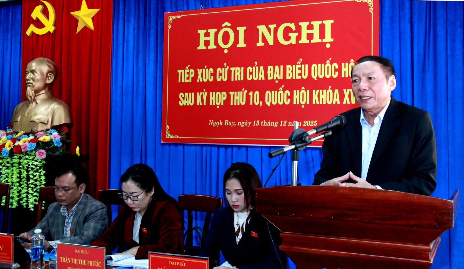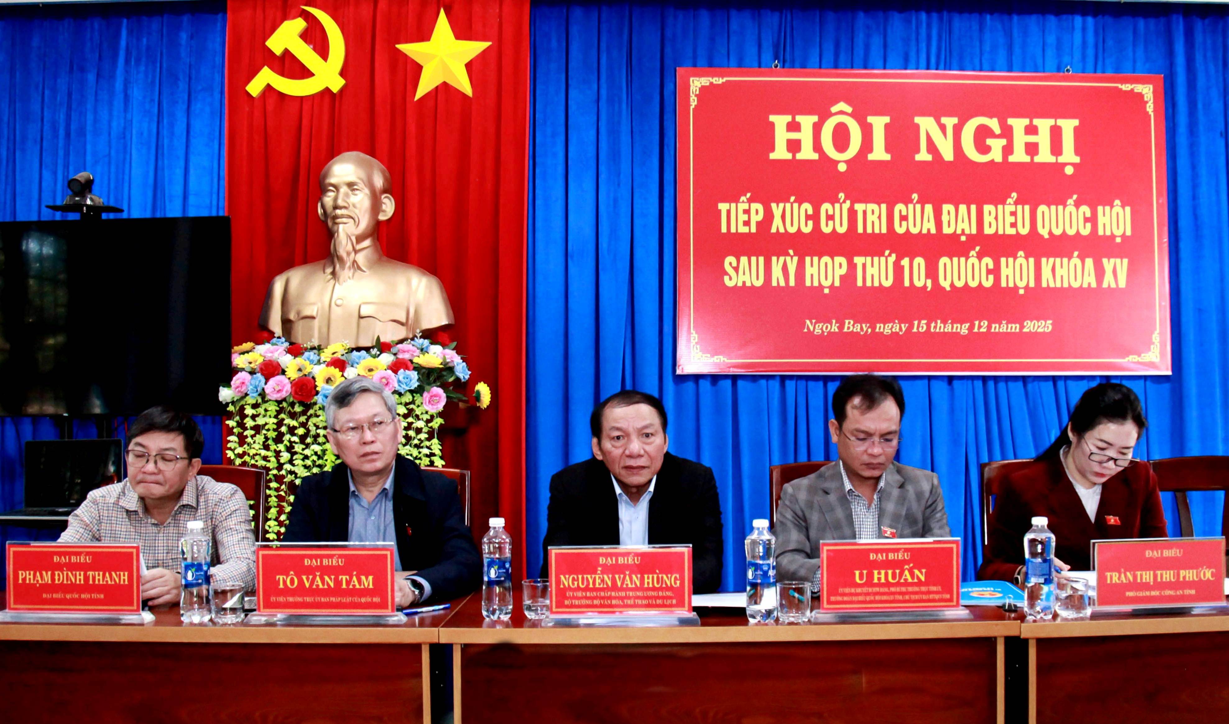 Sáng 15-12, Tổ đại biểu số 3, Đoàn ĐBQH tỉnh gồm: Ủy viên BCH Trung ương Đảng, Bộ trưởng Bộ Văn hóa, Thể thao và Du lịch Nguyễn Văn Hùng; Ủy viên dự khuyết BCH Trung ương Đảng, Phó Bí thư Thường trực Tỉnh ủy, Trưởng Đoàn ĐBQH tỉnh, Chủ tịch Ủy ban MTTQ Việt Nam tỉnh U Huấn; Ủy viên Thường trực Ủy ban Pháp luật của Quốc hội Tô Văn Tám; Phó Giám đốc Công an tỉnh Trần Thị Thu Phước và đại biểu Quốc hội tỉnh Phạm Đình Thanh đã tiếp xúc cử tri xã Ngọk Bay sau Kỳ họp thứ 10, Quốc hội khóa XV.