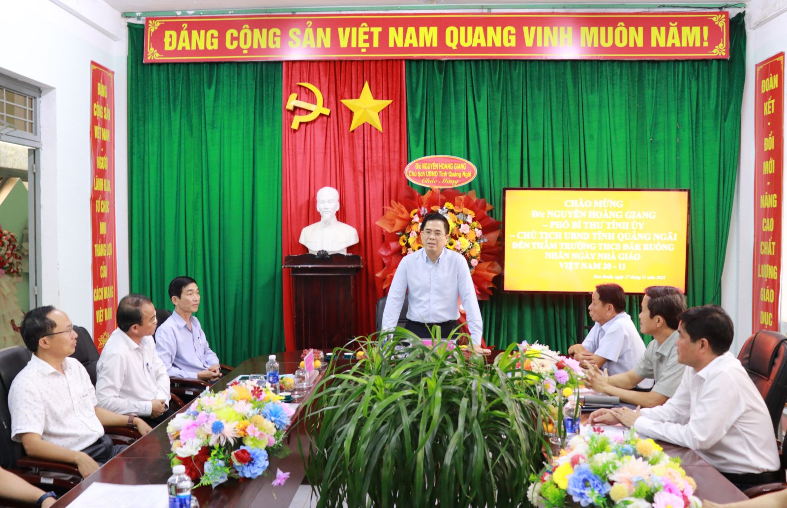 Tại buổi thăm, Chủ tịch UBND tỉnh Nguyễn Hoàng Giang gửi lời chúc mừng đến toàn thể đội ngũ cán bộ, giáo viên Trường THCS Đăk Ruồng nhân dịp Ngày Nhà giáo Việt Nam 20/11; đồng thời, ghi nhận tinh thần trách nhiệm, sự cống hiến thầm lặng của các thầy cô giáo đang công tác tại địa bàn vùng sâu, vùng xa, góp phần quan trọng vào sự nghiệp phát triển giáo dục của tỉnh.