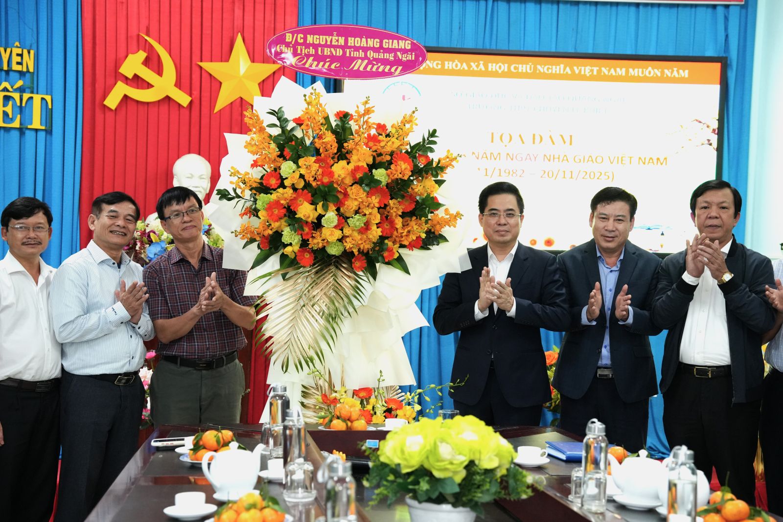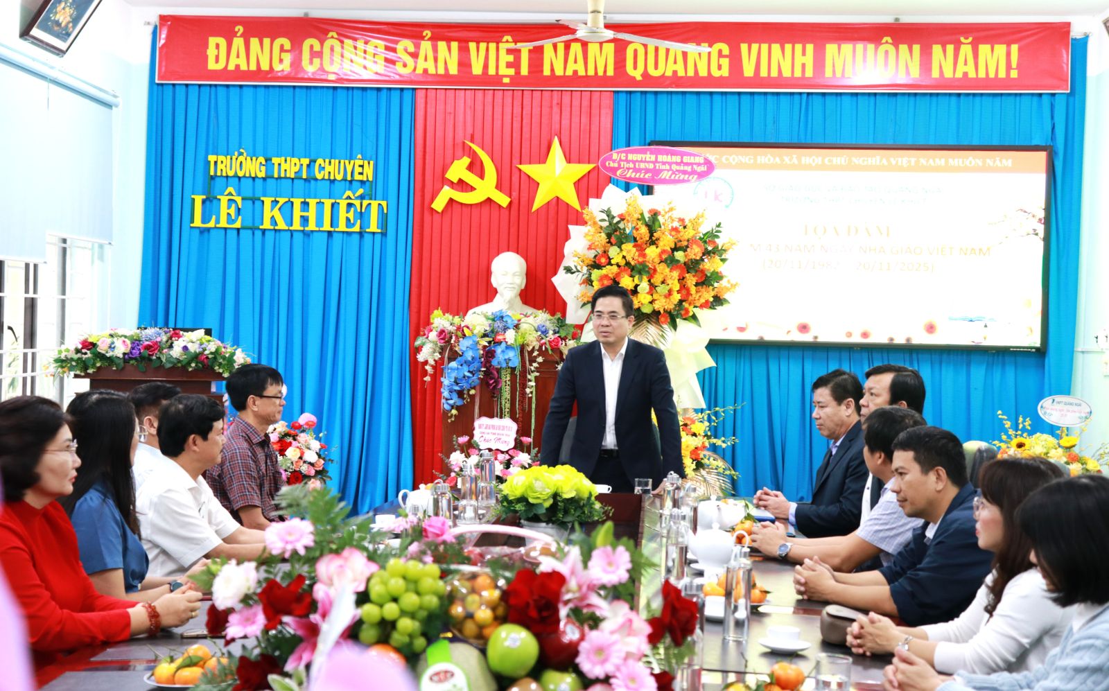 Đến thăm Trường THPT Chuyên Lê Khiết, Chủ tịch UBND tỉnh Nguyễn Hoàng Giang gửi lời chúc mừng đến tập thể cán bộ, giáo viên nhà trường nhân dịp kỷ niệm Ngày Nhà giáo Việt Nam. Chủ tịch UBND tỉnh ghi nhận và đánh giá cao những nỗ lực, thành tích nổi bật của nhà trường trong thời gian qua, đặc biệt là những đóng góp quan trọng trong công tác phát hiện, bồi dưỡng và đào tạo học sinh giỏi cho tỉnh.