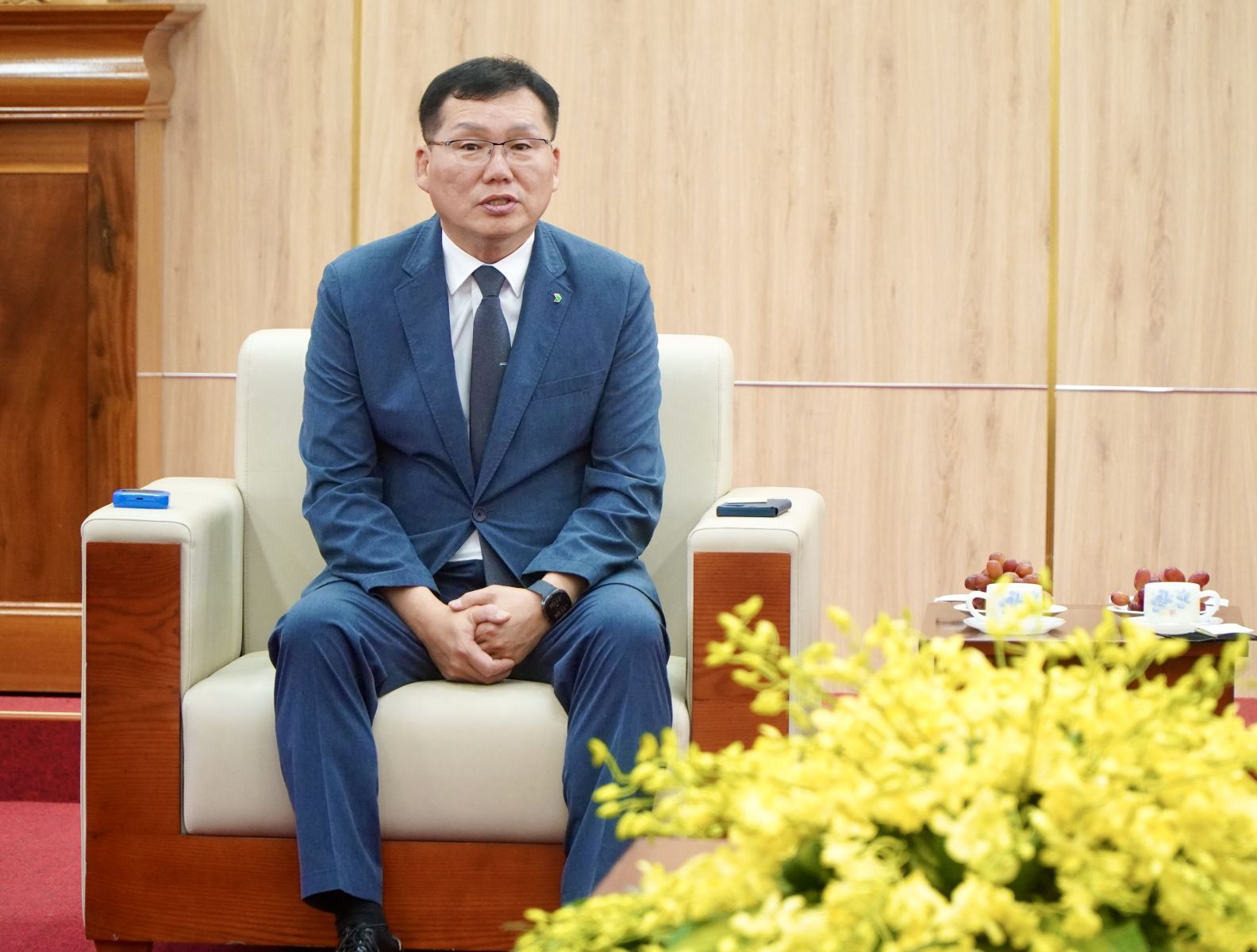 Phát biểu tại buổi tiếp, Chủ tịch UBND tỉnh Nguyễn Hoàng Giang chúc mừng Công ty HD Hyundai Heavy Industries đã thực hiện thành công quá trình chuyển giao giữa Doosan và Hyundai. Chủ tịch UBND tỉnh đánh giá cao uy tín, năng lực và kinh nghiệm toàn cầu của Tập đoàn Hyundai trong lĩnh vực công nghiệp nặng, cơ khí và năng lượng; đồng thời tin tưởng rằng, với tiềm lực tài chính, công nghệ và quản trị hiện đại, Công ty HD Hyundai Quảng Ngãi sẽ sớm phát huy hiệu quả, duy trì đà tăng trưởng ổn định, đóng góp tích cực cho sự phát triển kinh tế - xã hội của tỉnh.