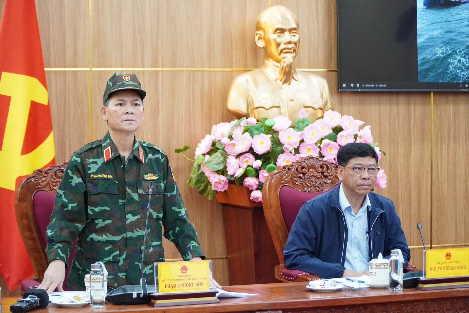Sáng 6/11, Đoàn công tác của Trung ương do Thứ trưởng Bộ Xây dựng Nguyễn Xuân Sang và Thượng tướng Phạm Trường Sơn, Phó Tổng tham mưu trưởng Quân đội nhân dân Việt Nam dẫn đầu có buổi làm việc với UBND tỉnh Quảng Ngãi về công tác ứng phó bão số 13 và trao đổi giải pháp xử lý sự cố tàu Star Bueno bị mắc cạn trên vùng biển Dung Quất, xã Vạn Tường, tỉnh Quảng Ngãi.