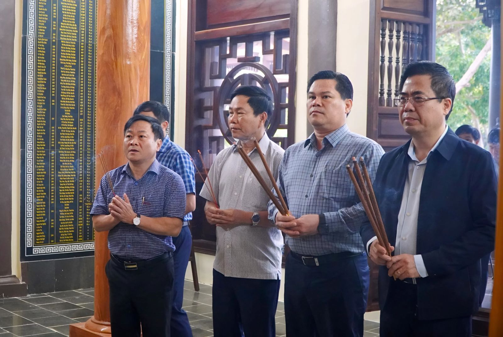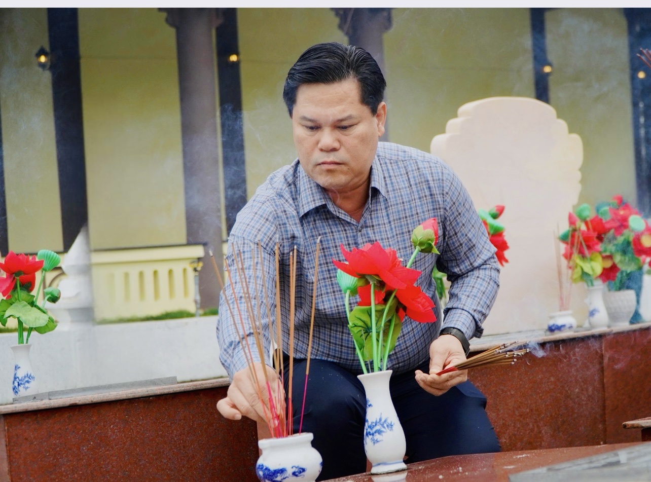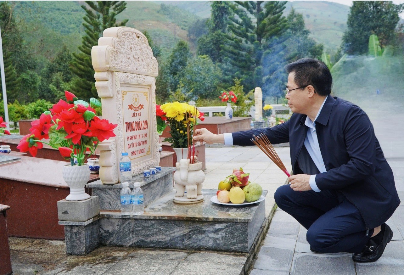 Trong không khí trang nghiêm, Chủ tịch UBND tỉnh Nguyễn Hoàng Giang, Phó Chủ tịch UBND tỉnh Trần Phước Hiền và các thành viên trong đoàn đã thành kính dâng hoa, dâng hương tại Đài tưởng niệm và từng phần mộ liệt sĩ, bày tỏ lòng biết ơn sâu sắc, tri ân công lao to lớn của các Anh hùng liệt sĩ đã anh dũng hy sinh vì độc lập, tự do của Tổ quốc.