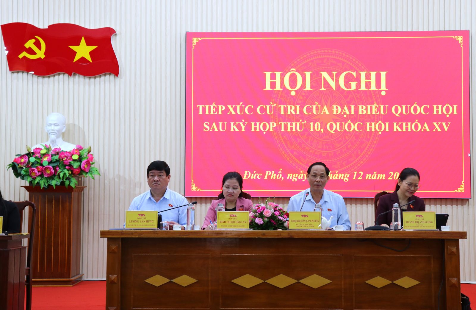 Sáng 15/12, Tổ đại biểu số 1, Đoàn ĐBQH tỉnh gồm: Thượng tướng Trần Quang Phương - Ủy viên Ban Chấp hành Trung ương Đảng, Phó Chủ tịch Quốc hội; Phó Chủ tịch Hội đồng Dân tộc của Quốc hội Đinh Thị Phương Lan; Phó Trưởng đoàn ĐBQH chuyên trách tỉnh Huỳnh Thị Ánh Sương; Phó Chánh Tòa án nhân dân tỉnh Lương Văn Hùng đã có buổi tiếp xúc với cử tri phường Đức Phổ.