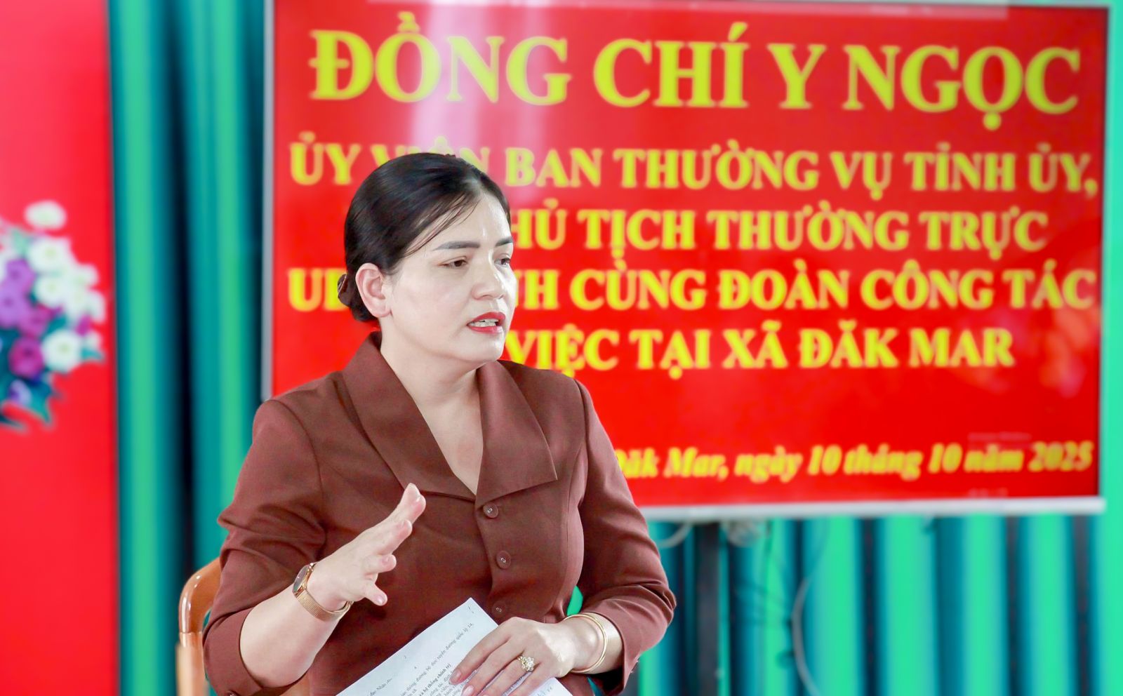 Sáng 10/10, Phó Chủ tịch Thường trực UBND tỉnh Y Ngọc làm việc về tình hình thực hiện nhiệm vụ phát triển kinh tế - xã hội, đảm bảo quốc phòng, an ninh và các nhiệm vụ trọng tâm trong thời gian tới tại xã Đăk Mar.