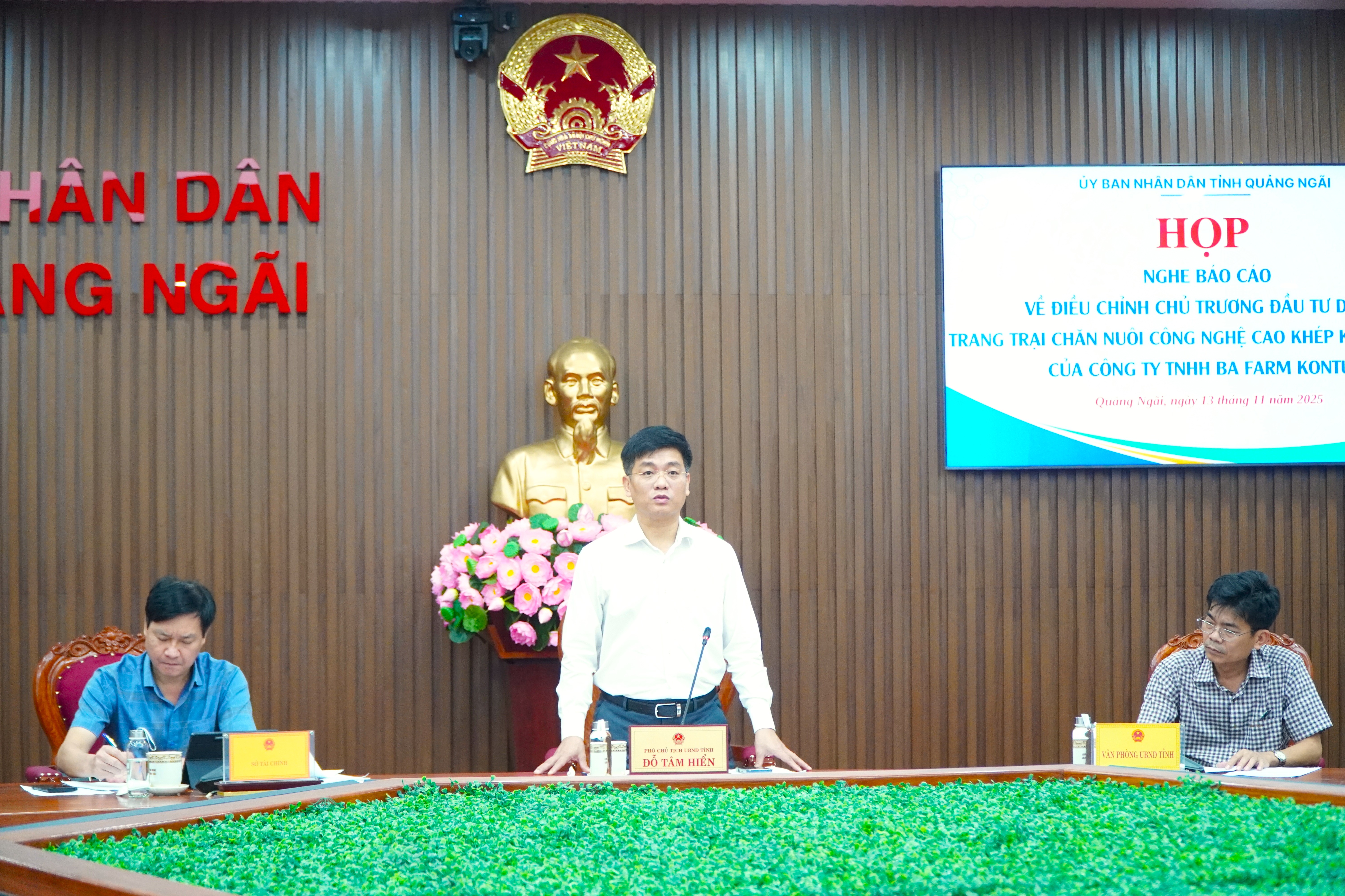 Phát biểu kết luận cuộc họp, Phó Chủ tịch UBND tỉnh Đỗ Tâm Hiển nhấn mạnh, tỉnh Quảng Ngãi luôn tạo điều kiện thuận lợi cho các nhà đầu tư, nhất là trong lĩnh vực nông nghiệp – chăn nuôi công nghệ cao, song việc triển khai dự án phải tuân thủ nghiêm quy định của pháp luật và cam kết tiến độ đã được cấp phép.