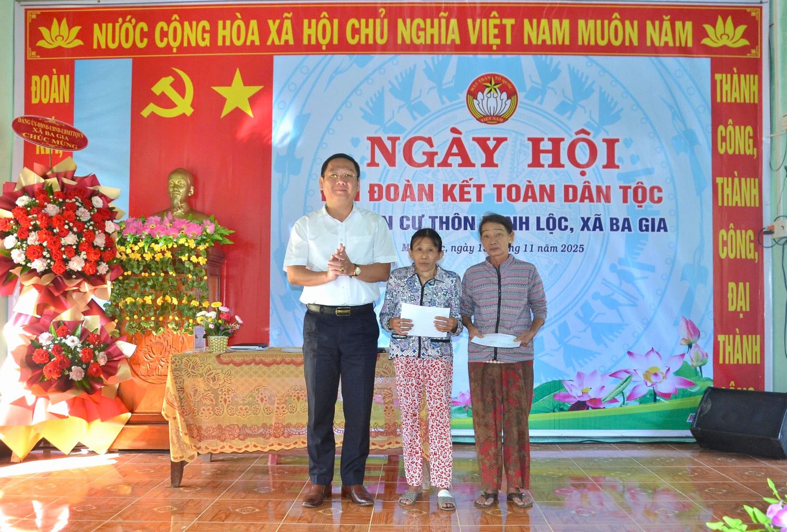 Dịp này, lãnh đạo tỉnh tặng quà cho các hộ gia đình có hoàn cảnh khó khăn trong Khu dân cư thôn Minh Lộc, xã Ba Gia.