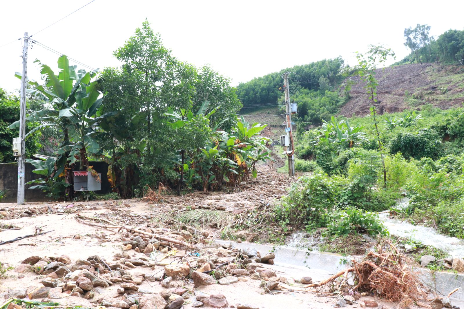 Tại xã Sơn Thủy, mưa lũ đã làm 12 ngôi nhà bị ảnh hưởng do sạt lở núi và xuất hiện 26 điểm sạt lở trên các tuyến giao thông. Địa phương đã huy động lực lượng, phương tiện, vật tư để khắc phục sạt lở, đảm bảo giao thông; đồng thời bố trí lực lượng canh gác, kiểm soát người và phương tiện tại các khu vực có nguy cơ cao.