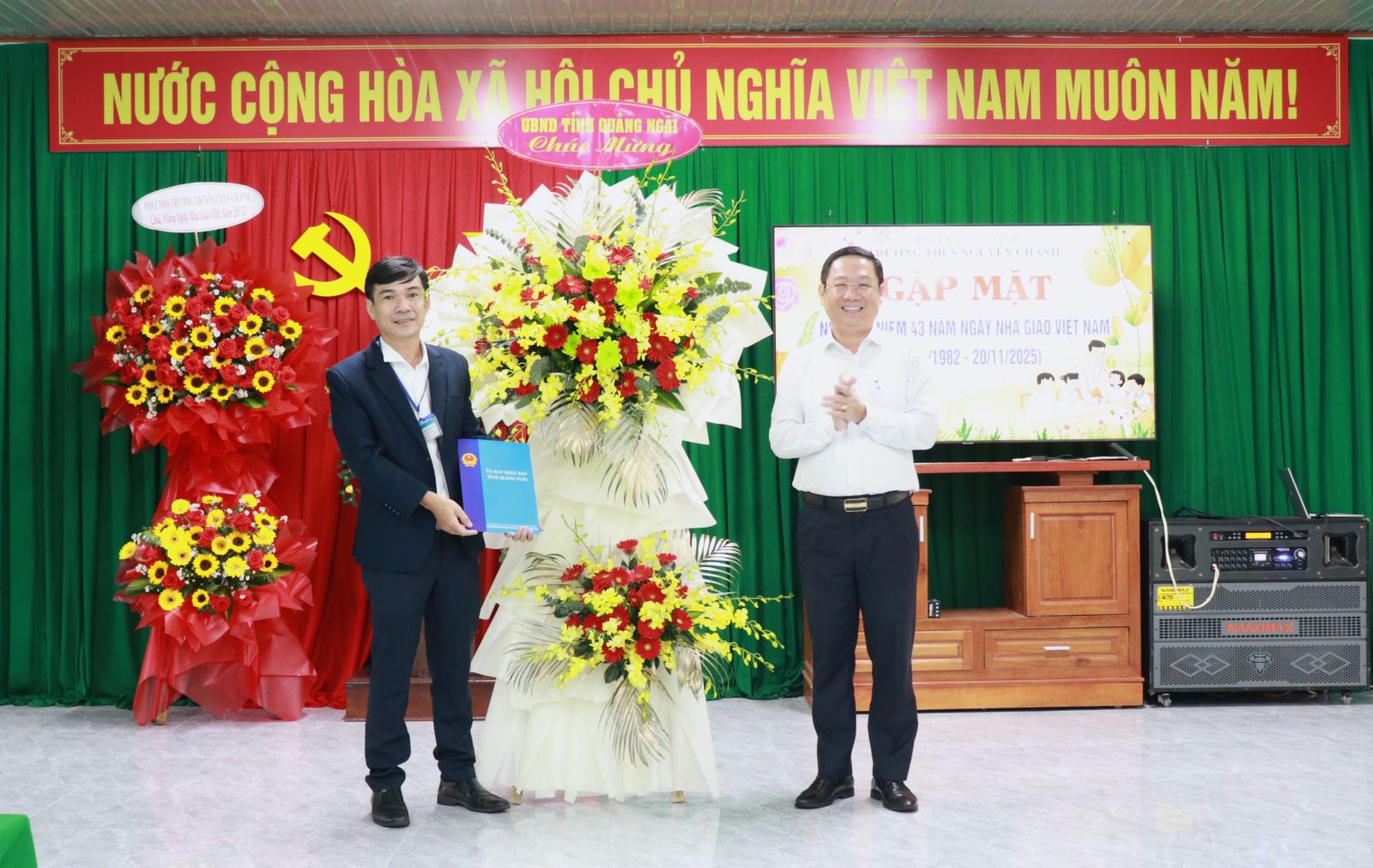 Nhân kỷ niệm 43 năm Ngày Nhà giáo Việt Nam (20/11/1982 - 20/11/2025), sáng 19/11, Phó Chủ tịch UBND tỉnh Nguyễn Công Hoàng đã đến thăm, chúc mừng đội ngũ nhà giáo, cán bộ quản lý tại Trường THCS Nguyễn Chánh và Trường THCS Nguyễn Đôn. Cùng đi có lãnh đạo Sở Giáo dục và Đào tạo, lãnh đạo Văn phòng UBND tỉnh và lãnh đạo UBND xã Sơn Tịnh.