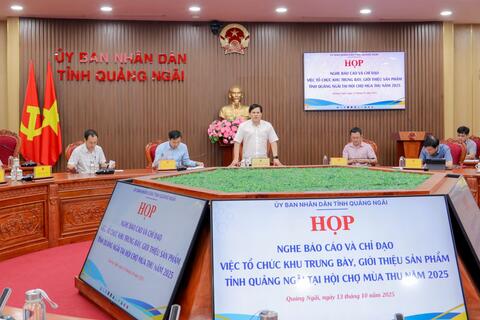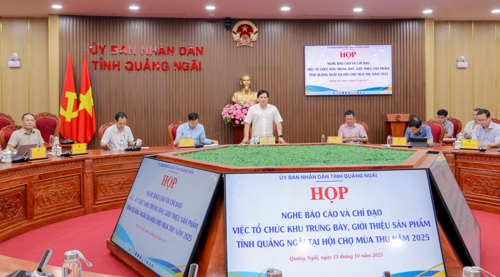 Sáng 13/10, Phó Chủ tịch UBND tỉnh Trần Phước Hiền chủ trì họp để nghe báo cáo và chỉ đạo việc tổ chức Khu trưng bày, giới thiệu sản phẩm tỉnh Quảng Ngãi tại Hội chợ Mùa Thu năm 2025. Dự họp có lãnh đạo các sở, ngành liên quan và đại diện đơn vị tư vấn thiết kế.