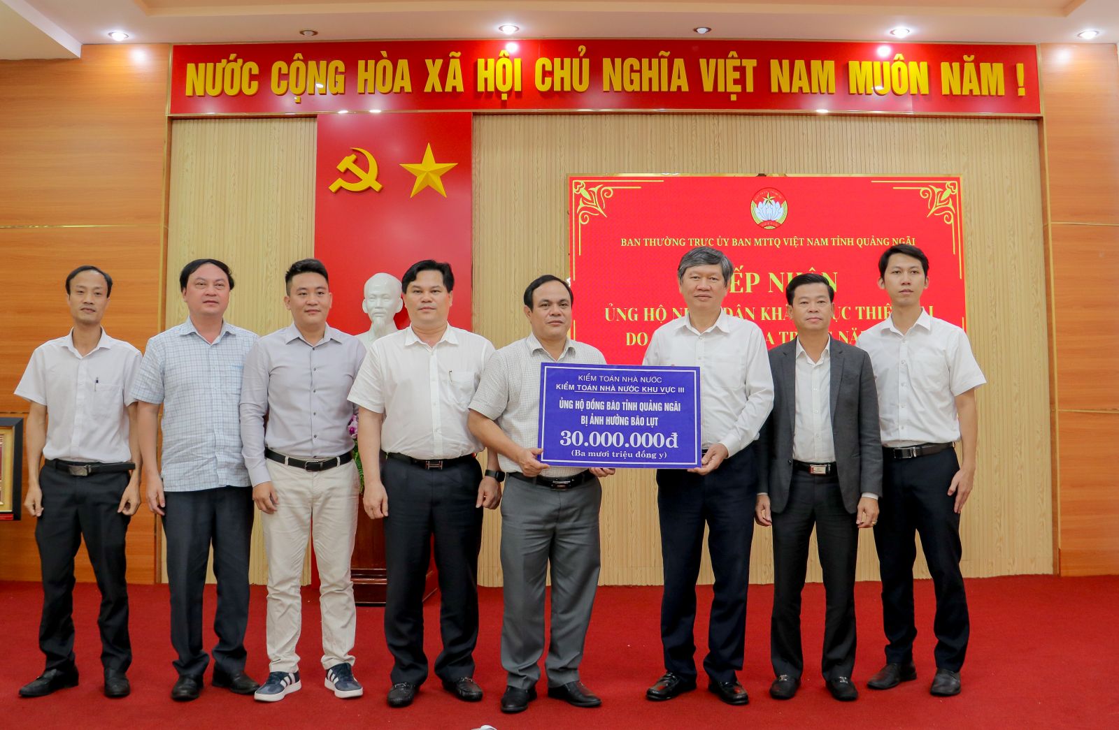 Phát biểu tại buổi tiếp nhận, Phó Chủ tịch Ủy ban MTTQ Việt Nam tỉnh Hồ Ngọc Thịnh gửi lời cảm ơn đến Đoàn Kiểm toán Nhà nước Khu vực III; và các cơ quan, đơn vị, doanh nghiệp, nhất là bà con đồng hương Quảng Ngãi đã chung tay ủng hộ công tác khắc phục hậu quả bão lũ. Sự ủng hộ này là nguồn động viên quan trọng, tiếp thêm nghị lực để Đảng bộ, chính quyền và người dân trong tỉnh vượt qua khó khăn, sớm khôi phục sản xuất và ổn định đời sống sau bão lũ.
