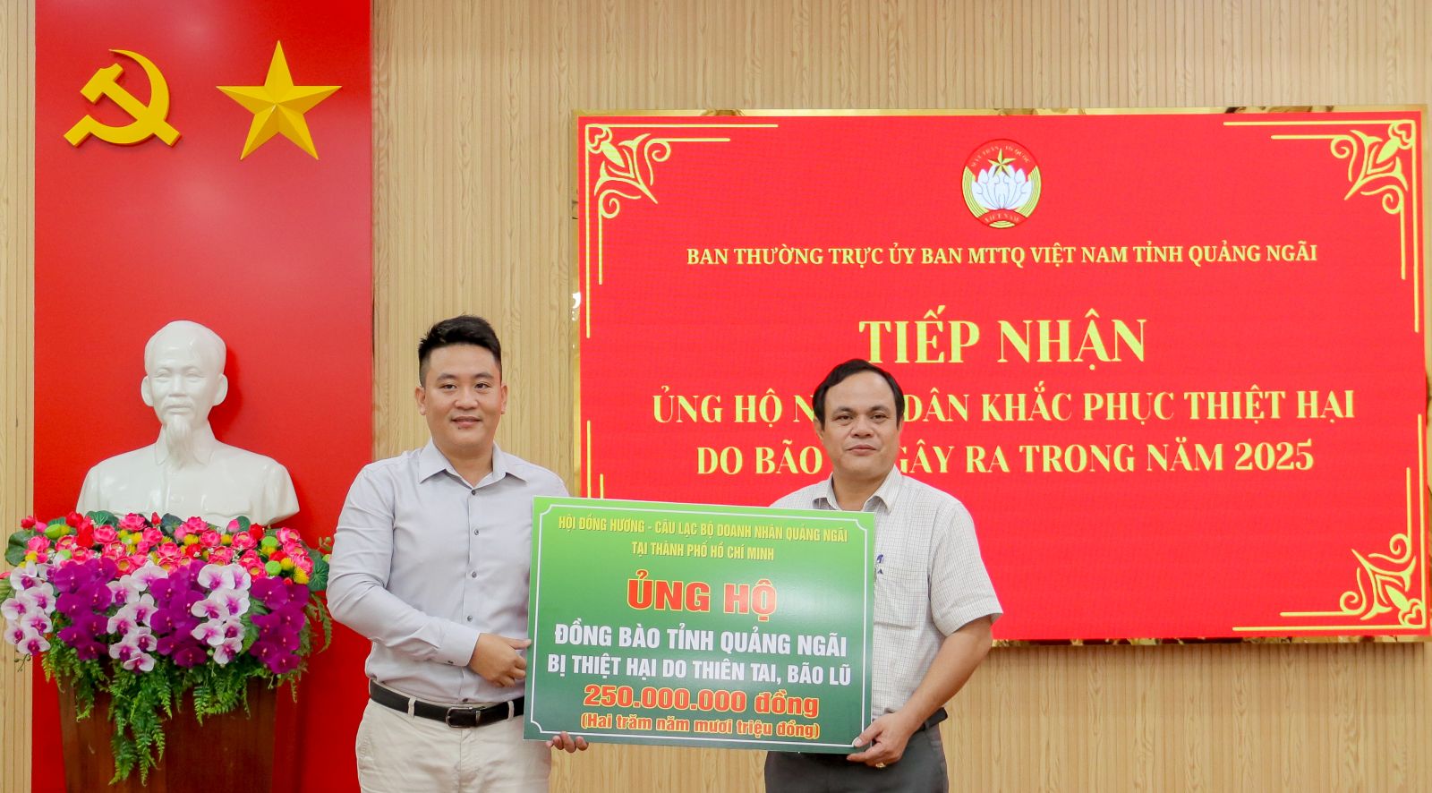 Ngoài ra, Hội đồng hương – Câu lạc bộ Doanh nhân Quảng Ngãi tại thành phố Hồ Chí Minh đã ủng hộ 250 triệu đồng, góp thêm nguồn lực để tỉnh kịp thời hỗ trợ các hộ dân bị thiệt hại, tạo điều kiện để địa phương triển khai hiệu quả công tác khắc phục hậu quả sau bão lũ.