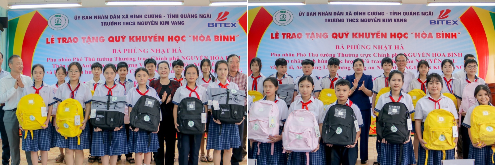 Quỹ Khuyến học “Hòa Bình” đã trao tặng 700 triệu đồng để xây dựng Quỹ Khuyến học, đồng thời trao tặng 500 ba lô và 500 bộ đồ dùng học tập cho học sinh Trường THCS Nguyễn Kim Vang.