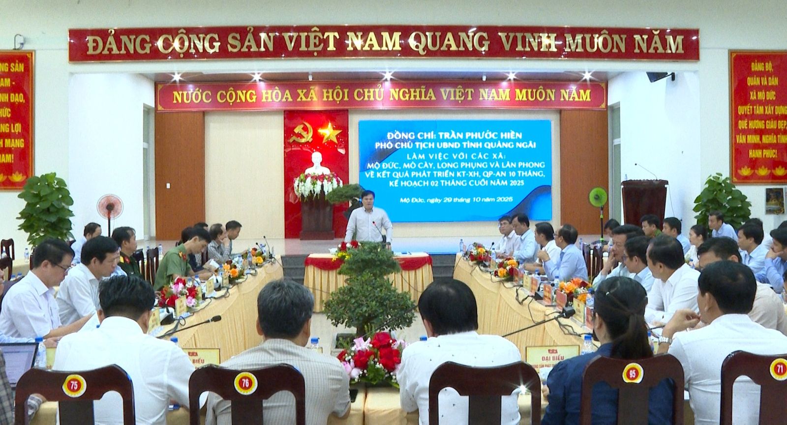 Sáng 29-10, Phó Chủ tịch UBND tỉnh Trần Phước Hiền đã chủ trì làm việc với UBND các xã: Mộ Đức, Long Phụng, Lân Phong, Mỏ Cày về kết quả phát triển kinh tế - xã hội, quốc phòng an ninh các tháng đầu năm, kế hoạch các tháng cuối năm 2025; triển khai các nhiệm vụ ứng phó với tình hình mưa, lũ.