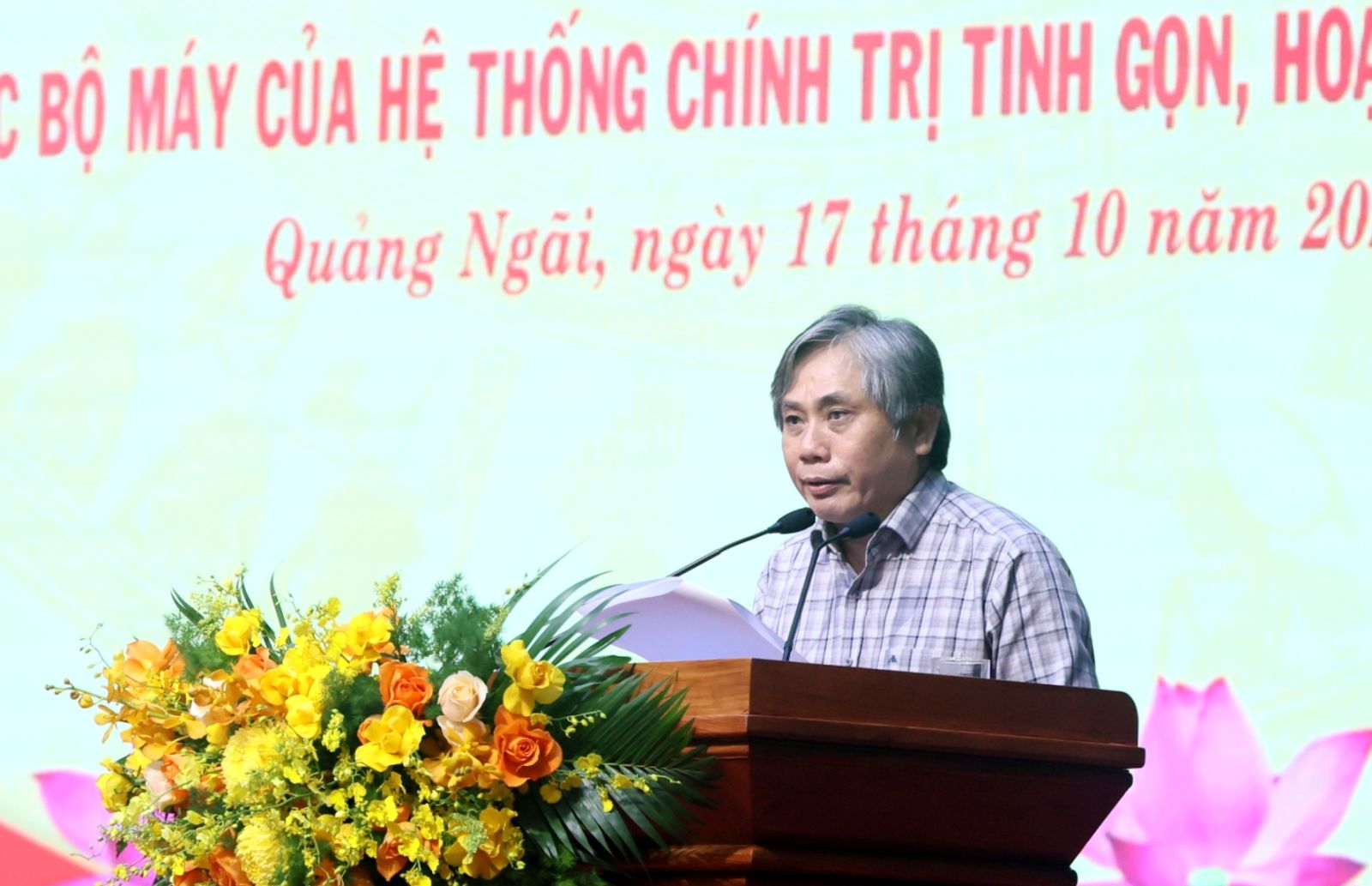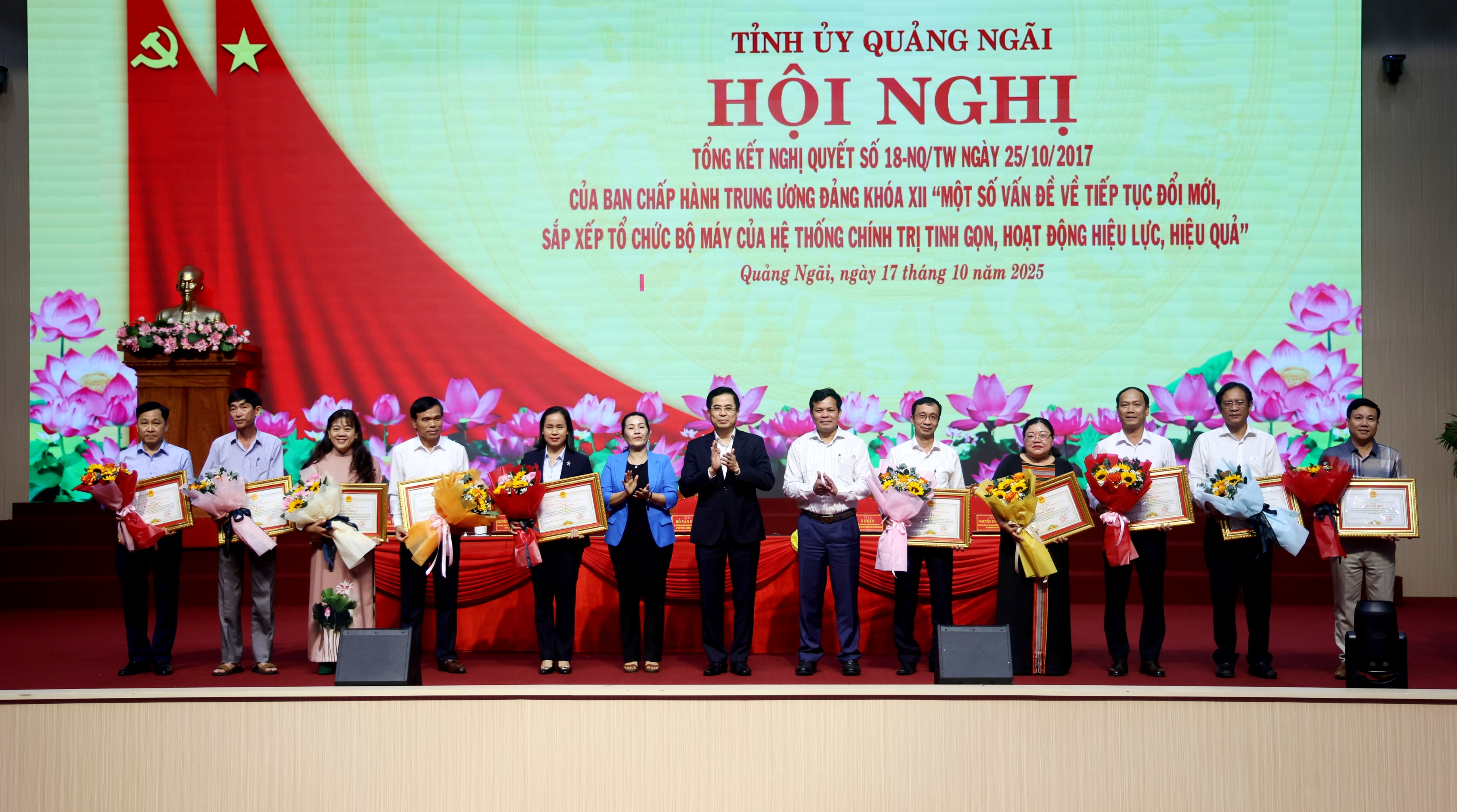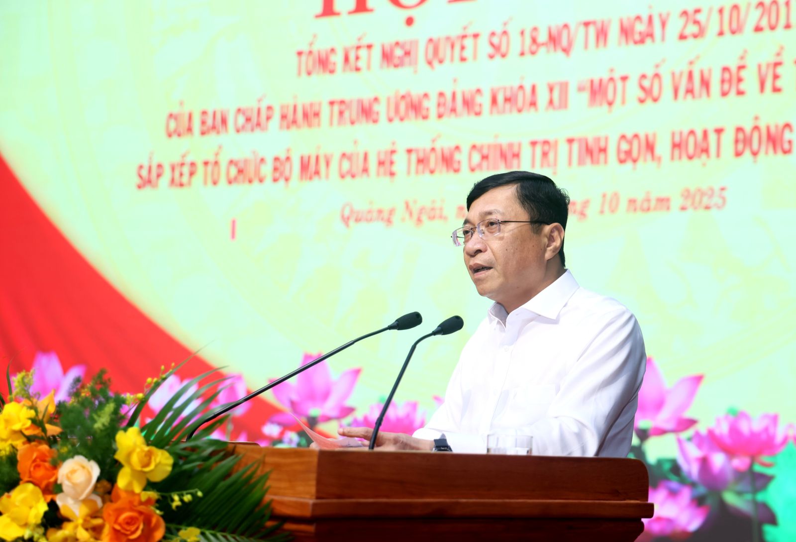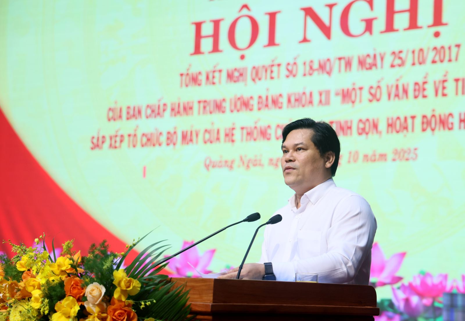 Chiều 17-10, Ban Thường vụ Tỉnh ủy Quảng Ngãi tổ chức Hội nghị tổng kết Nghị quyết số 18-NQ/TW ngày 25/10/2017 của Ban Chấp hành Trung ương Đảng khóa XII “Một số vấn đề về tiếp tục đổi mới, sắp xếp tổ chức bộ máy của hệ thống chính trị tinh gọn, hoạt động hiệu lực, hiệu quả”.
