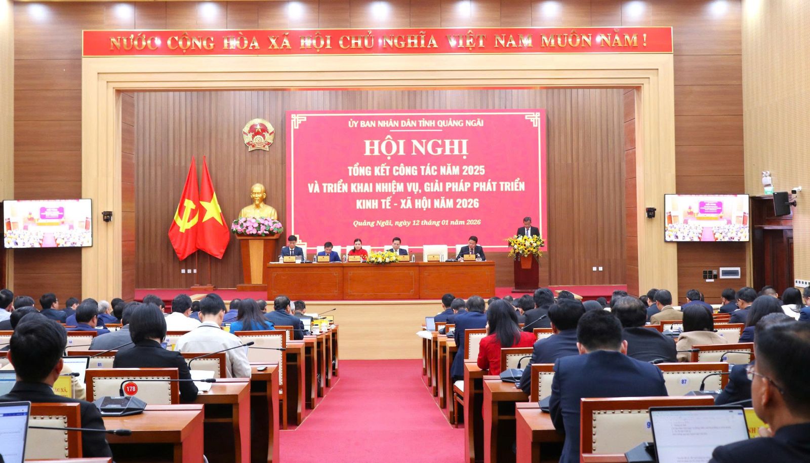 Chiều 12-01, Chủ tịch UBND tỉnh Nguyễn Hoàng Giang, các Phó Chủ tịch UBND tỉnh: Y Ngọc, Nguyễn Ngọc Sâm, Trần Phước Hiền, Nguyễn Công Hoàng, Đỗ Tâm Hiển chủ trì Hội nghị tổng kết công tác năm 2025 và triển khai nhiệm vụ, giải pháp phát triển kinh tế – xã hội năm 2026.