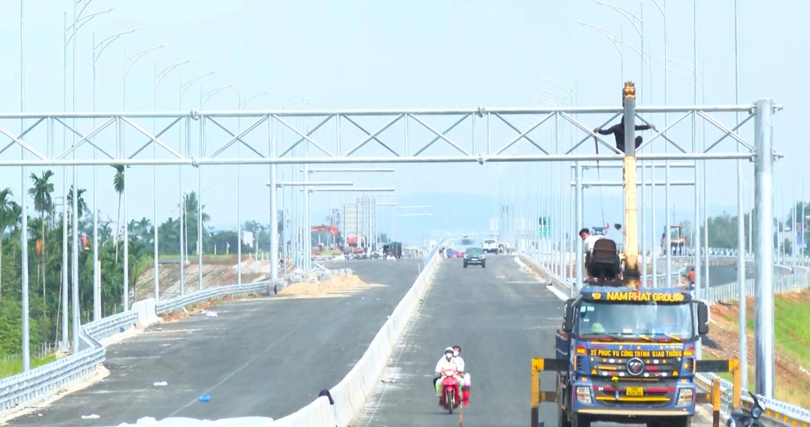 Về phần đường, hiện đã hoàn thành việc thi công cấp phối đá dăm và tiến hành công đoạn bê tông nhựa và bê tông xi măng đạt từ 94-99%; hệ thống tôn hộ lan và dải phân cách – lưới chống chói đã sản xuất, tập kết đạt 100%, đang hoàn thiện lắp đặt (tương ứng 94% và 81%).