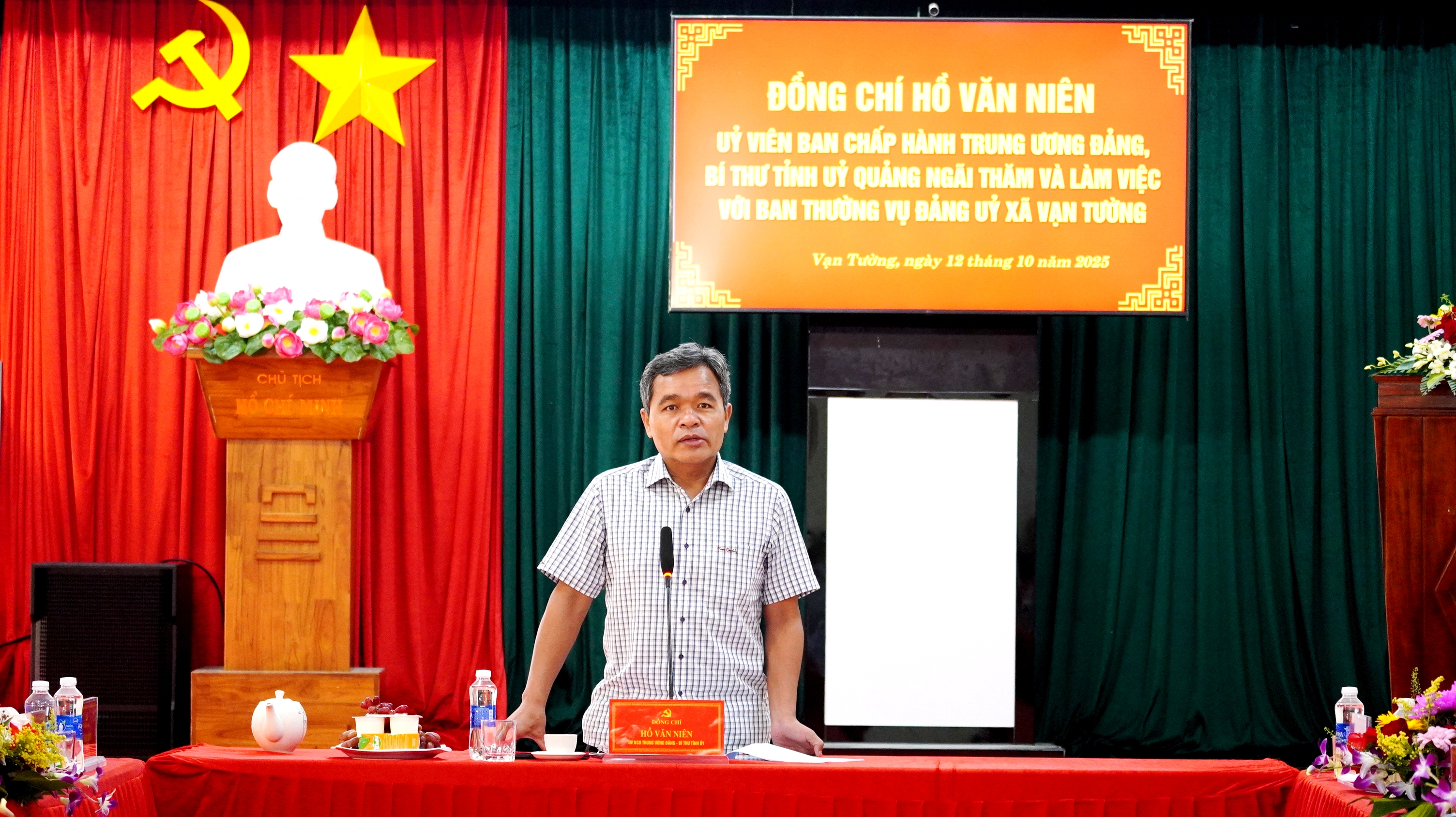 Phát biểu chỉ đạo tại buổi làm việc, Ủy viên Trung ương Đảng, Bí thư Tỉnh ủy Hồ Văn Niên ghi nhận, biểu dương và đánh giá cao sự chủ động, tích cực của Đảng ủy xã Vạn Tường trong thời gian qua. Đồng chí nhấn mạnh, Vạn Tường nằm trong vùng lõi Khu kinh tế Dung Quất, có nhiều doanh nghiệp lớn, nhiều tiềm năng và lợi thế để phát triển kinh tế – xã hội, đặc biệt là địa phương có số thu ngân sách cao của tỉnh.