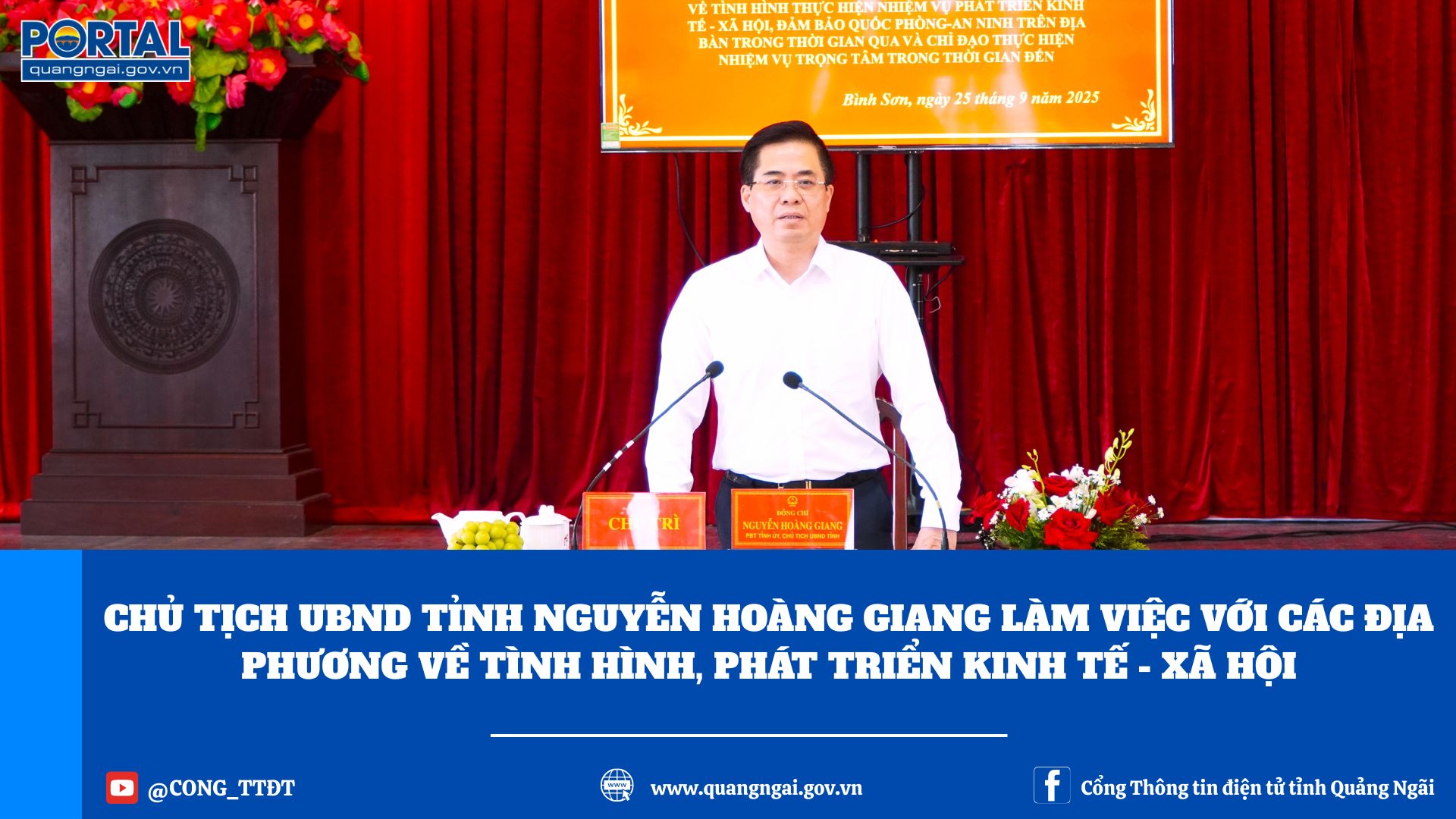 Chiều 25-9, tại trụ sở UBND xã Bình Sơn, Chủ tịch UBND tỉnh Nguyễn Hoàng Giang chủ trì buổi làm việc với UBND các xã: Bình Sơn, Vạn Tường, Đông Sơn, Bình Minh, Bình Chương về tình hình thực hiện nhiệm vụ phát triển kinh tế - xã hội, đảm bảo quốc phòng, an ninh trên địa bàn trong thời gian qua và chỉ đạo các nhiệm vụ trọng tâm trong thời gian đến.