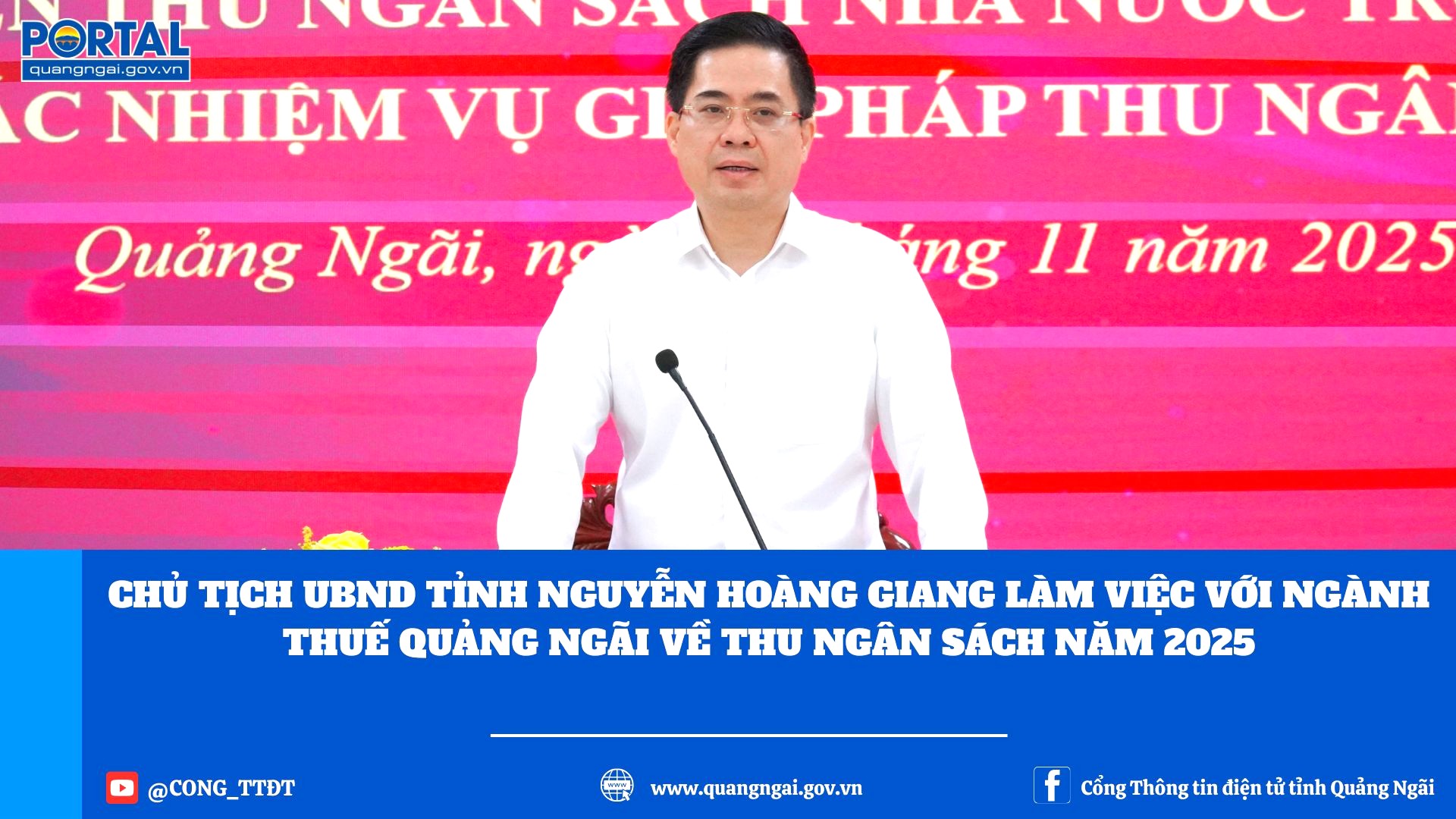 Sáng 19-11, Chủ tịch UBND tỉnh Nguyễn Hoàng Giang chủ trì buổi làm việc với Thuế Quảng Ngãi về tình hình thực hiện thu ngân sách nhà nước trong thời gian qua và triển khai thực hiện các nhiệm vụ giải pháp thu ngân sách trong những tháng cuối năm 2025. Dự buổi làm việc có lãnh đạo các sở, ban ngành và đại diện một số doanh nghiệp trên địa bàn tỉnh.