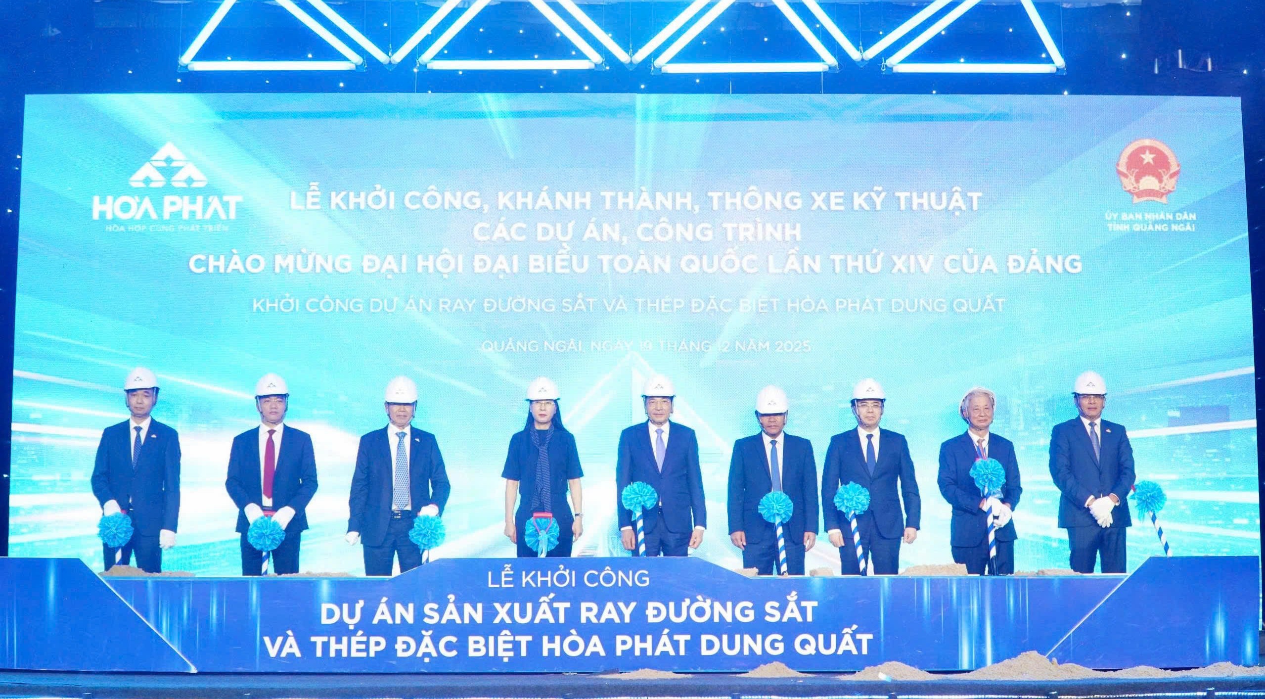 Sáng 19/12, cùng với 79 điểm cầu trực tuyến và trực tiếp trên cả nước, tại xã Bình Sơn (tỉnh Quảng Ngãi) đã tổ chức khởi công Dự án Nhà máy Sản xuất Ray và Thép đặc biệt Hòa Phát Dung Quất. Đây là 1 trong 4 dự án trọng điểm được tổ chức khởi công và khánh thành đồng loạt trên địa bàn tỉnh vào sáng, gồm: Dự án Nhà máy Sản xuất Ray và Thép đặc biệt Hòa Phát Dung Quất (điểm cầu chính); Hệ thống thu gom, xử lý nước mưa – nước thải lưu vực Nam sông Trà Khúc; Dự án nâng cấp, mở rộng hạ tầng giao thông Khu kinh tế Dung Quất; và Dự án Cao tốc Quảng Ngãi – Hoài Nhơn.