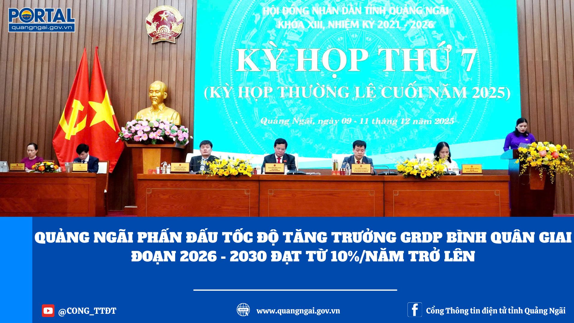 Tại phiên khai mạc Kỳ họp thứ 7, HĐND tỉnh khóa XIII, nhiệm kỳ 2021 - 2026 diễn ra vào sáng 09-12, Phó Chủ tịch Thường trực UBND tỉnh Y Ngọc đã báo cáo công tác chỉ đạo, điều hành của UBND tỉnh và tình hình kinh tế - xã hội, quốc phòng, an ninh giai đoạn 2021 - 2025; nhiệm vụ, giải pháp trọng tâm năm 2026 và giai đoạn 2026 - 2030. Trong đó, phấn đấu tốc độ tăng trưởng GRDP bình quân giai đoạn 2026 - 2030 đạt từ 10%/năm trở lên và phấn đấu đến năm 2030, Quảng Ngãi trở thành tỉnh phát triển khá, là một cực tăng trưởng quan trọng của khu vực miền Trung - Tây Nguyên.